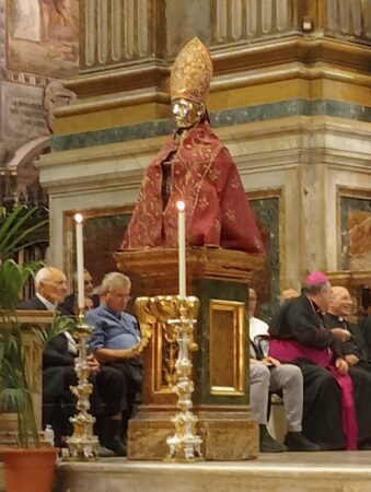 In occasione dei Primi Vespri che hanno aperto la 75ª Settimana Liturgica Nazionale, sono stati esposti in via del tutto eccezionale nella Cattedrale il busto e l’ampolla con il Sangue di San Gennaro. Alle ore 17.50 è stato dato l’annuncio dell’avvenuta liquefazione del Sangue del Patrono di Napoli.