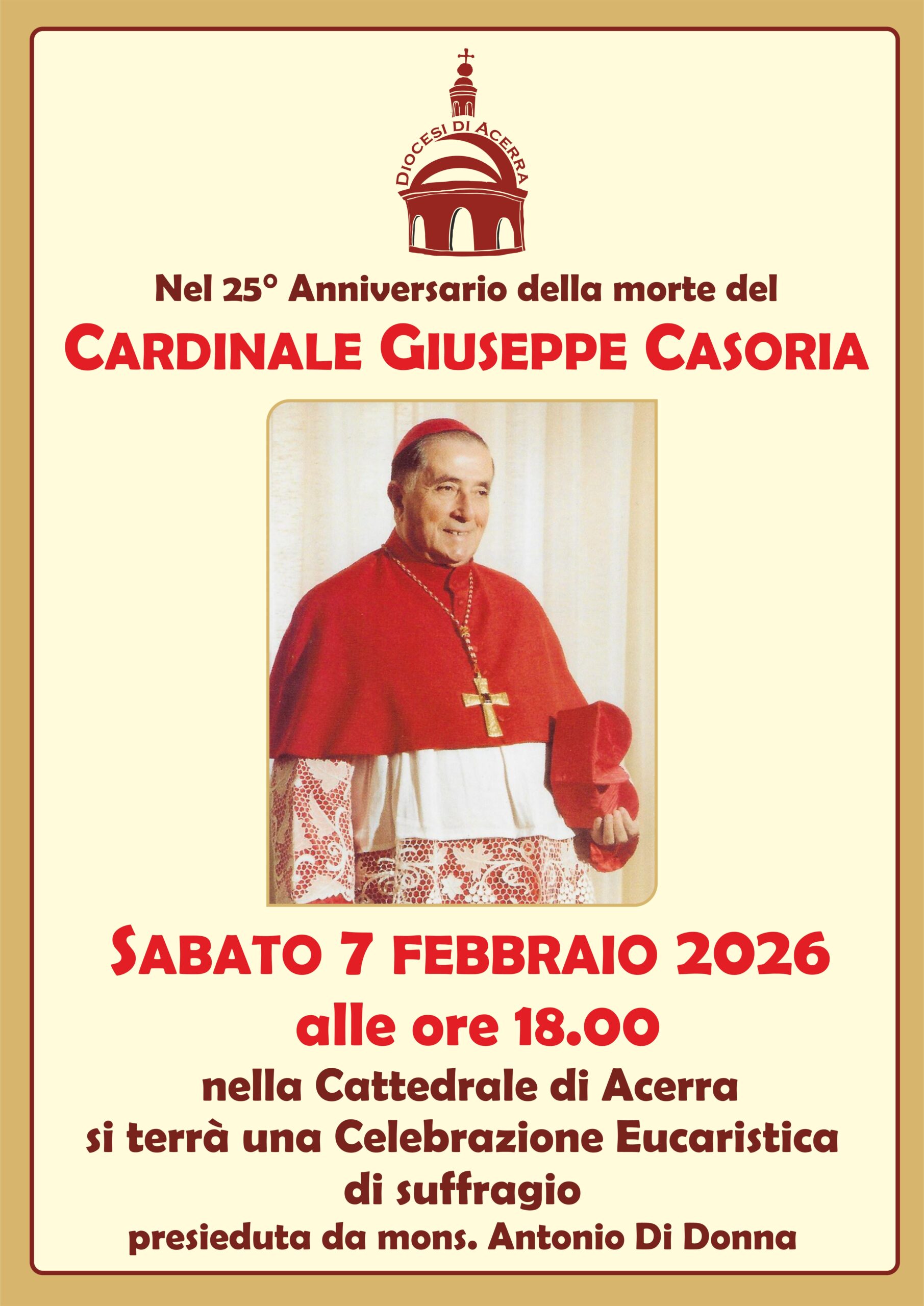 news A 25 anni dalla morte del cardinale Casoria 4 Febbraio 2026 Cardinale Giuseppe Casoria Messa di suffragio a 25 anni dalla morte Cattedrale di Acerra Sabato 7 febbraio ore 18.00 Condividi… Facebook Whatsapp Twitter Telegram Messenger