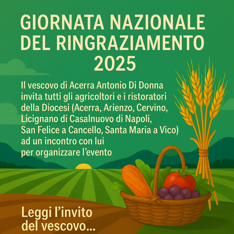 comunicato stampa AD ACERRA LA GIORNATA NAZIONALE DEL RINGRAZIAMENTO PER I FRUTTI DELLA TERRA “GIUBILEO, RIGENERAZIONE DELLA TERRA E SPERANZA PER L’UMANITÀ” CONFERENZA STAMPA DI PRESENTAZIONE MERCOLEDI’ 29 OTTOBRE ORE 11 BIBLIOTECA VESCOVILE – PIAZZA DUOMO, ACERRA Nei giorni otto e nove novembre la Diocesi di Acerra e l’Ufficio Nazionale per i problemi sociali e il lavoro della Conferenza Episcopale italiana organizzano ad Acerra due … Continua a leggere CONFERENZA STAMPA DI PRESENTAZIONE