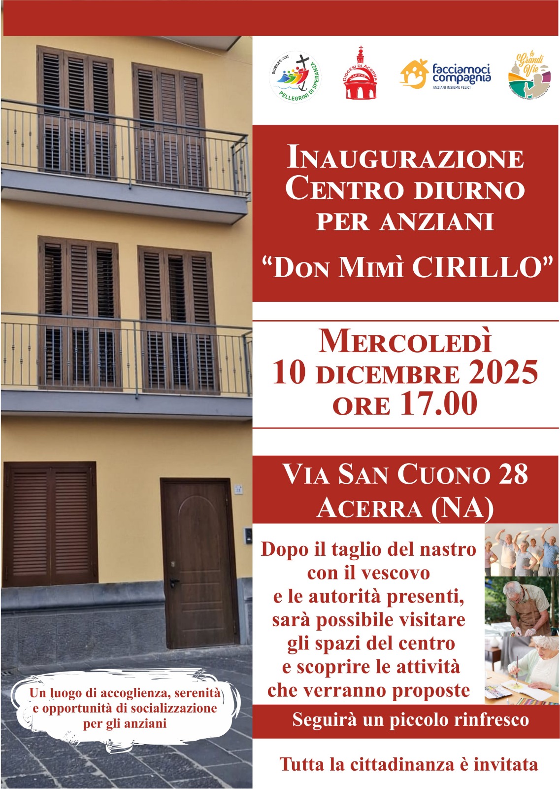 Sono lieto di invitarvi alla cerimonia di inaugurazione del nuovo Centro Diurno per Anziani intitolato a don Mimì Cirillo, già parroco della parrocchia Maria SS. Annunziata, un luogo pensato con la Caritas diocesana per offrire accoglienza, serenità e opportunità di socializzazione a tutti i nostri cari anziani.