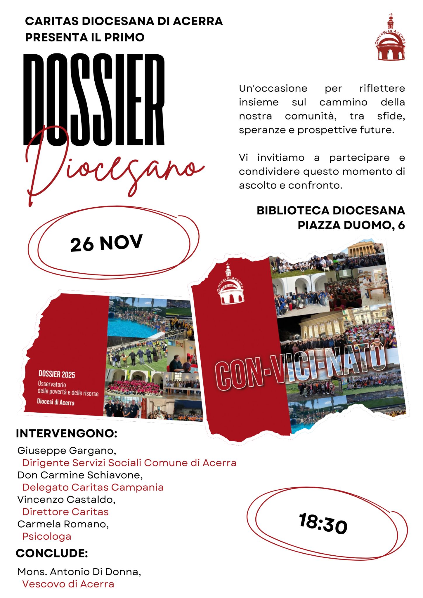 Interverranno Giuseppe Gargano, Dirigente Servizi Sociali del Comune di Acerra, don Carmine Schiavone, Delegato Caritas Campania, Vincenzo Castaldo, Direttore Caritas Acerra, Carmela Romano, Psicologa. Conclusioni affidate al vescovo di Acerra Antonio Di Donna.