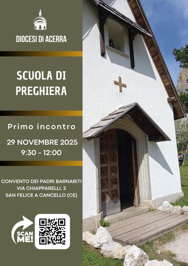 Perciò per rendere sempre più le nostre comunità “scuole di preghiera”, ho voluto avviare la Scuola diocesana di preghiera. Il primo incontro è fissato per sabato 11 gennaio 2025 dalle 09:30 alla 12:00 nel “Centro pastorale San Giuseppe” ad Acerra (piazzale San Giuseppe, 1).